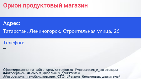 Орион, продуктовый магазин по адресу Татарстан, Лениногорск, Строительная улица, 26 в дальнейшем Организация, размещена в следующих категориях: