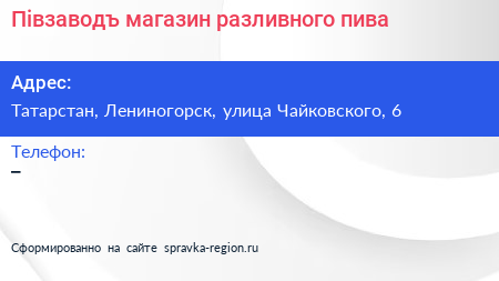 Пiвзаводъ, магазин разливного пива по адресу Татарстан, Лениногорск, улица Чайковского, 6 в дальнейшем Организация, размещена в следующих категориях: