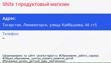 Shifa-1, продуктовый магазин по адресу Татарстан, Лениногорск, улица Куйбышева, 46 ст1 в дальнейшем Организация, размещена в следующих категориях: