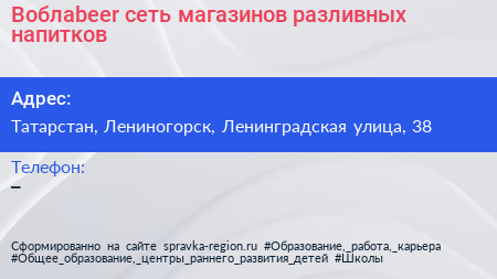Воблаbeer, сеть магазинов разливных напитков по адресу Татарстан, Лениногорск, Ленинградская улица, 38 в дальнейшем Организация, размещена в следующих категориях: