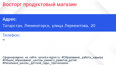 Восторг, продуктовый магазин по адресу Татарстан, Лениногорск, улица Лермонтова, 20 в дальнейшем Организация, размещена в следующих категориях: