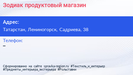 Зодиак, продуктовый магазин по адресу Татарстан, Лениногорск, Садриева, 38 в дальнейшем Организация, размещена в следующих категориях: