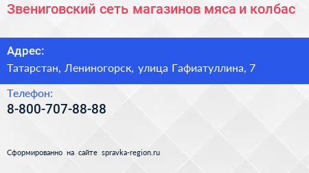 Звениговский, сеть магазинов мяса и колбас по адресу Татарстан, Лениногорск, улица Гафиатуллина, 7 в дальнейшем Организация, размещена в следующих категориях: