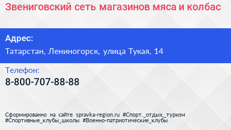 Звениговский, сеть магазинов мяса и колбас по адресу Татарстан, Лениногорск, улица Тукая, 14 в дальнейшем Организация, размещена в следующих категориях: