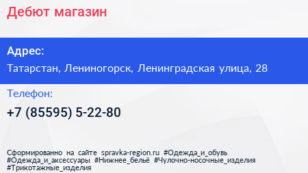 Дебют, магазин по адресу Татарстан, Лениногорск, Ленинградская улица, 28 в дальнейшем Организация, размещена в следующих категориях:
