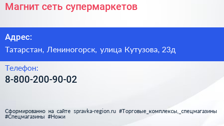 Магнит, сеть супермаркетов по адресу Татарстан, Лениногорск, улица Кутузова, 23д в дальнейшем Организация, размещена в следующих категориях: