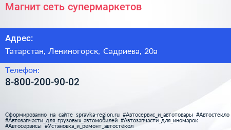 Магнит, сеть супермаркетов по адресу Татарстан, Лениногорск, Садриева, 20а в дальнейшем Организация, размещена в следующих категориях: