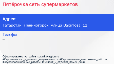 Пятёрочка, сеть супермаркетов по адресу Татарстан, Лениногорск, улица Вахитова, 12 в дальнейшем Организация, размещена в следующих категориях: