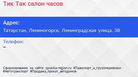 Тик-Так, салон часов по адресу Татарстан, Лениногорск, Ленинградская улица, 38 в дальнейшем Организация, размещена в следующих категориях: