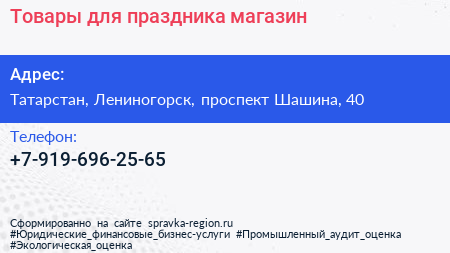 Товары для праздника, магазин по адресу Татарстан, Лениногорск, проспект Шашина, 40 в дальнейшем Организация, размещена в следующих категориях: