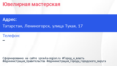 Ювелирная мастерская по адресу Татарстан, Лениногорск, улица Тукая, 17 в дальнейшем Организация, размещена в следующих категориях: