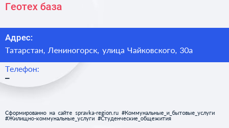 Геотех, база по адресу Татарстан, Лениногорск, улица Чайковского, 30а в дальнейшем Организация, размещена в следующих категориях: