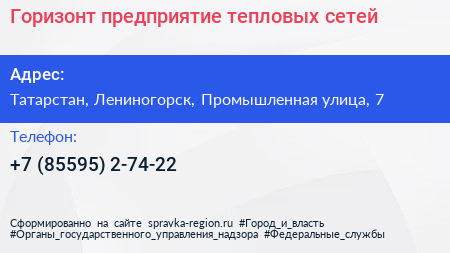 Горизонт, предприятие тепловых сетей по адресу Татарстан, Лениногорск, Промышленная улица, 7 в дальнейшем Организация, размещена в следующих категориях: