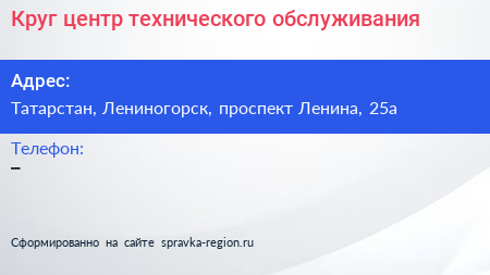 Круг, центр технического обслуживания по адресу Татарстан, Лениногорск, проспект Ленина, 25а в дальнейшем Организация, размещена в следующих категориях: