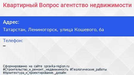 Квартирный Вопрос, агентство недвижимости по адресу Татарстан, Лениногорск, улица Кошевого, 6а в дальнейшем Организация, размещена в следующих категориях: