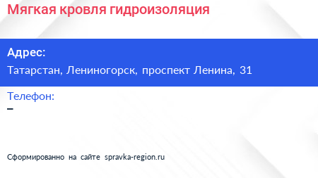 Мягкая кровля, гидроизоляция по адресу Татарстан, Лениногорск, проспект Ленина, 31 в дальнейшем Организация, размещена в следующих категориях:
