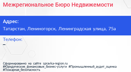 Межрегиональное Бюро Недвижемости по адресу Татарстан, Лениногорск, Ленинградская улица, 75а в дальнейшем Организация, размещена в следующих категориях: