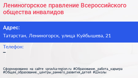 Лениногорское правление Всероссийского общества инвалидов по адресу Татарстан, Лениногорск, улица Куйбышева, 21 в дальнейшем Организация, размещена в следующих категориях:
