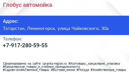 Глобус, автомойка по адресу Татарстан, Лениногорск, улица Чайковского, 30а в дальнейшем Организация, размещена в следующих категориях: