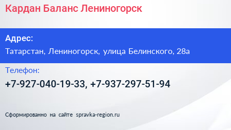 Кардан-Баланс Лениногорск по адресу Татарстан, Лениногорск, улица Белинского, 28а в дальнейшем Организация, размещена в следующих категориях: