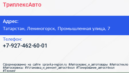 ТриплексАвто по адресу Татарстан, Лениногорск, Промышленная улица, 7 в дальнейшем Организация, размещена в следующих категориях: