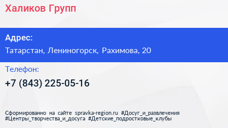 Халиков Групп по адресу Татарстан, Лениногорск, Рахимова, 20 в дальнейшем Организация, размещена в следующих категориях: