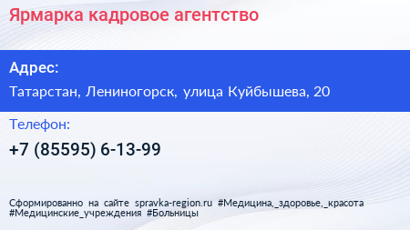 Ярмарка, кадровое агентство по адресу Татарстан, Лениногорск, улица Куйбышева, 20 в дальнейшем Организация, размещена в следующих категориях: