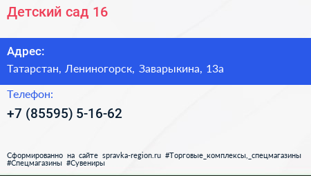 Детский сад №16 по адресу Татарстан, Лениногорск, Заварыкина, 13а в дальнейшем Организация, размещена в следующих категориях: