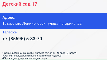 Детский сад №17 по адресу Татарстан, Лениногорск, улица Гагарина, 52 в дальнейшем Организация, размещена в следующих категориях: