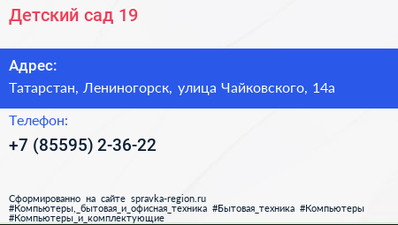 Детский сад №19 по адресу Татарстан, Лениногорск, улица Чайковского, 14а в дальнейшем Организация, размещена в следующих категориях: