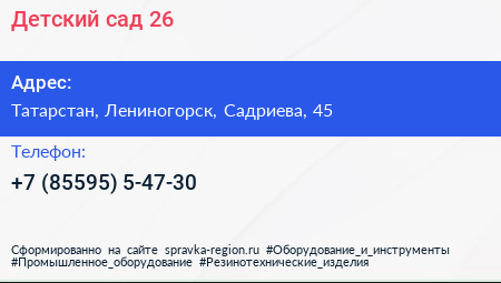 Детский сад №26 по адресу Татарстан, Лениногорск, Садриева, 45 в дальнейшем Организация, размещена в следующих категориях: