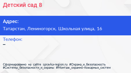 Детский сад №8 по адресу Татарстан, Лениногорск, Школьная улица, 16 в дальнейшем Организация, размещена в следующих категориях: