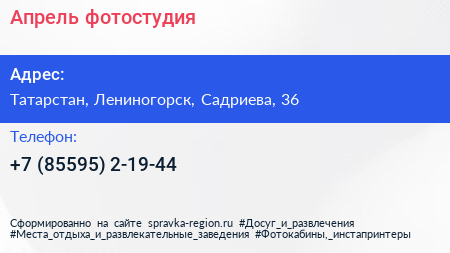 Апрель, фотостудия по адресу Татарстан, Лениногорск, Садриева, 36 в дальнейшем Организация, размещена в следующих категориях: