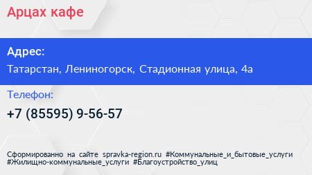 Арцах, кафе по адресу Татарстан, Лениногорск, Стадионная улица, 4а в дальнейшем Организация, размещена в следующих категориях: