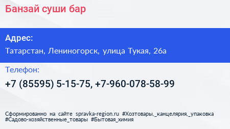 Банзай, суши-бар по адресу Татарстан, Лениногорск, улица Тукая, 26а в дальнейшем Организация, размещена в следующих категориях: