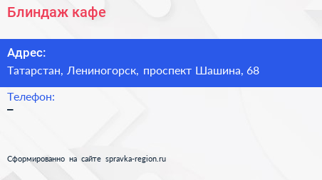 Блиндаж, кафе по адресу Татарстан, Лениногорск, проспект Шашина, 68 в дальнейшем Организация, размещена в следующих категориях: