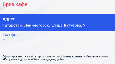Бриз, кафе по адресу Татарстан, Лениногорск, улица Кутузова, 9 в дальнейшем Организация, размещена в следующих категориях: