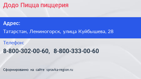 Додо Пицца, пиццерия по адресу Татарстан, Лениногорск, улица Куйбышева, 28 в дальнейшем Организация, размещена в следующих категориях: