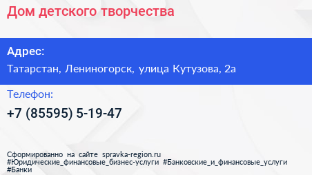 Дом детского творчества по адресу Татарстан, Лениногорск, улица Кутузова, 2а в дальнейшем Организация, размещена в следующих категориях: