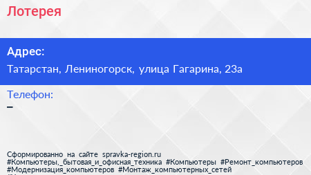 Лотерея по адресу Татарстан, Лениногорск, улица Гагарина, 23а в дальнейшем Организация, размещена в следующих категориях: