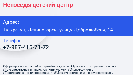 Непоседы, детский центр по адресу Татарстан, Лениногорск, улица Добролюбова, 14 в дальнейшем Организация, размещена в следующих категориях: