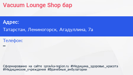 Vacuum Lounge & Shop, бар по адресу Татарстан, Лениногорск, Агадуллина, 7а в дальнейшем Организация, размещена в следующих категориях: