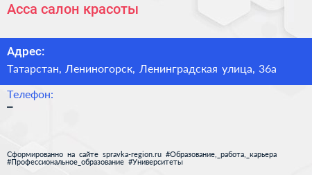 Асса, салон красоты по адресу Татарстан, Лениногорск, Ленинградская улица, 36а в дальнейшем Организация, размещена в следующих категориях:
