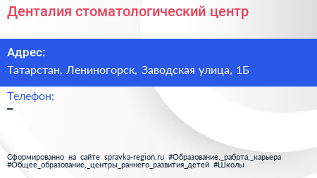 Денталия, стоматологический центр по адресу Татарстан, Лениногорск, Заводская улица, 1Б в дальнейшем Организация, размещена в следующих категориях: