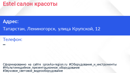Estel, салон красоты по адресу Татарстан, Лениногорск, улица Крупской, 12 в дальнейшем Организация, размещена в следующих категориях: