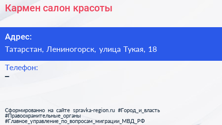 Кармен, салон красоты по адресу Татарстан, Лениногорск, улица Тукая, 18 в дальнейшем Организация, размещена в следующих категориях: