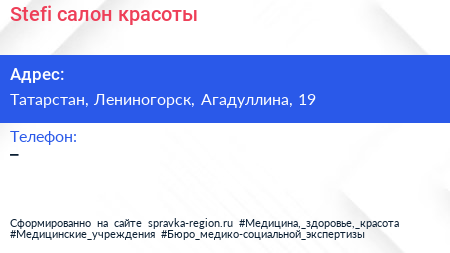 Stefi, салон красоты по адресу Татарстан, Лениногорск, Агадуллина, 19 в дальнейшем Организация, размещена в следующих категориях: