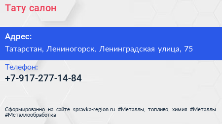 Тату-салон по адресу Татарстан, Лениногорск, Ленинградская улица, 75 в дальнейшем Организация, размещена в следующих категориях: