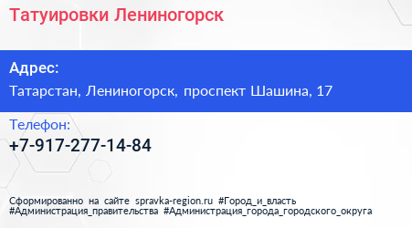 Татуировки Лениногорск по адресу Татарстан, Лениногорск, проспект Шашина, 17 в дальнейшем Организация, размещена в следующих категориях: