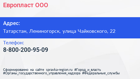 Европласт, ООО по адресу Татарстан, Лениногорск, улица Чайковского, 22 в дальнейшем Организация, размещена в следующих категориях: